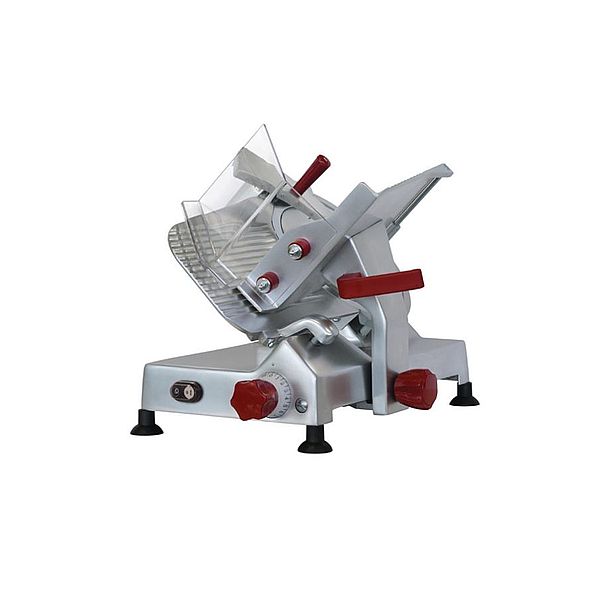 Gravity feed meat slicer offering a forged steel blade capable of slicing the variety of foods essential to restaurants, kitchens and fast food outlets. Belt driven with blade sharpener, as well as safety cut out switch on the blade cover. The Safe Guard Safety System reduces the potential for injury. Hygienic, durable and functional.